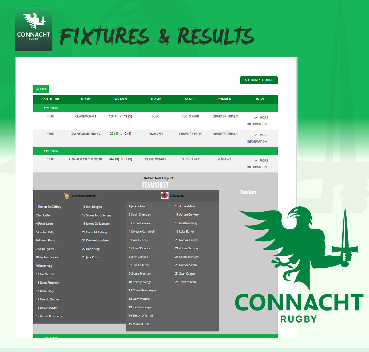 Connacht Rugby Fixtures and Results with Team Panels